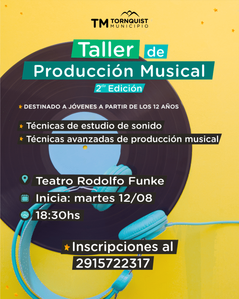 El martes 12 de agosto comenzará una nueva edición del Taller de Producción Musical, impulsado por la Subsecretaría de Infancias y Juventudes, a través del Centro Juvenil Futuro Joven. Esta propuesta formativa tiene como objetivo introducir a los participantes (a partir de 12 años) en el universo de la creación musical, abordando técnicas de estudio de sonido y técnicas avanzadas de producción musical. La actividad tendrá lugar a las 18.30 hs en el Teatro Municipal ‘Rodolfo Funke’ y los interesados en formar parte, podrán inscribirse en a través del número 291 572-2317. Este espacio busca fomentar la expresión artística, el desarrollo de habilidades técnicas y la creatividad de las juventudes, acompañando sus intereses en un entorno educativo y accesible.
